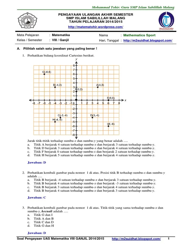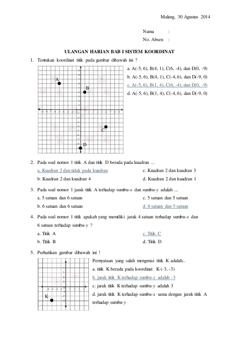 Sistem koordinat kartesius digunakan untuk menentukan tiap titik dalam bidang dengan menggunakan 2 bilangan yang biasa disebut koordinat x . Himpunan kumpulan contoh soal latihan matematika sekolah dasar kelas enam sistem koordinat sd kelas 6 semester 2 lengkap plus ulasan penjabaran materi . Dari gambar di atas bisa kita jumpati jika terdapat 4 titik yang sudah ditandai. Contoh soal dengan pembahasan koordinat kartesius. Artikel ini akan menjelaskan tentang pengertian koordinat kartesius, cara membuatnya, hingga contoh soal dan pembahasan. Hari ini kakak akan bagi ke kalian latihan soal tentang bidang koordinat cartesius. Pertanyaan dari koordinat cartesius letak di kuadran dengan . Inilah yang menjadi acuan dalam menentukan letak suatu titik. Hari ini kita akan belajar latihan soal tentang sistem koordinat.